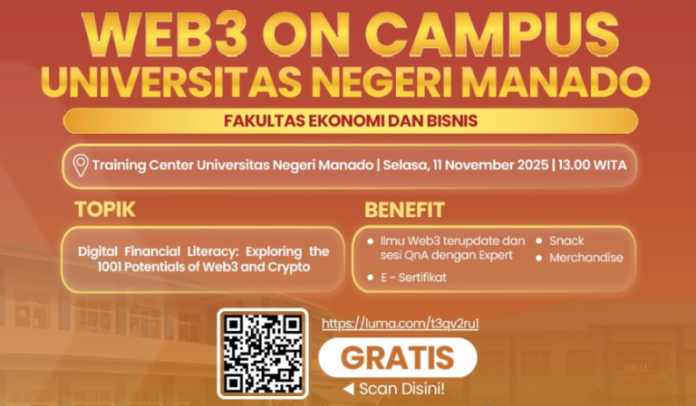 Tahun 2025 ini hadir di Fakultas Ekonomi dan Bisnis Universitas Negeri Manado dengan topik edukasi Web3 & inovasi teknologi digital yang kekinian, inspiratif, dan pastinya relevan untuk generasi masa kini! 🙌🏻 Gratis untuk Mahasiswa dan Umum! 📚 Dengan topik utama:Digital Financial Literacy: Exploring the 1001 Potentials of Web3 and Crypto 👤 Bersama para pembicara inspiratif:Lavio Zulian – Growth Manager OKX South East AsiaBudi Santosa – Founder IDNFT ✨ Save the Date ✨📅 : Selasa, 11 November 2025⏰ : 13.00 WIB – Selesai📍 : Training Center Universitas Negeri ManadoREGISTRATION FOR FREEhttps://luma.com/t3qv2ru1 🎁 Benefit: Ilmu Web3 terupdate dan sesi QnA